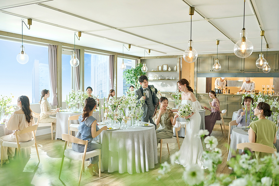 装花を一新し、白と緑を基調とした温もりのあるコーディネートへ。自然光あふれる会場と調和し、清らかで心地よい空間でのパーティを叶えます。リニューアル後のチャペルは、上質でありながらもリラックスできる雰囲気に。
