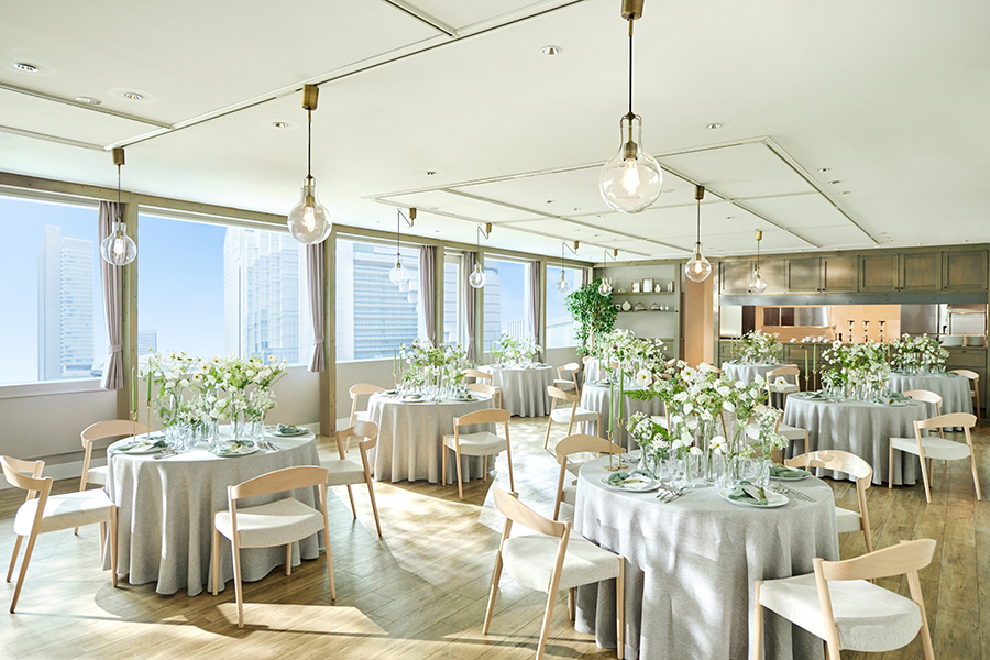 窓の外には開放感ある大阪梅田の景色が広がる、オープンキッチンを併設したナチュラルな空間。自然光あふれるアットホームな空間は少人数利用にも最適。会場は中央を仕切ることもできるので、空間コーディネートは自由自在です。