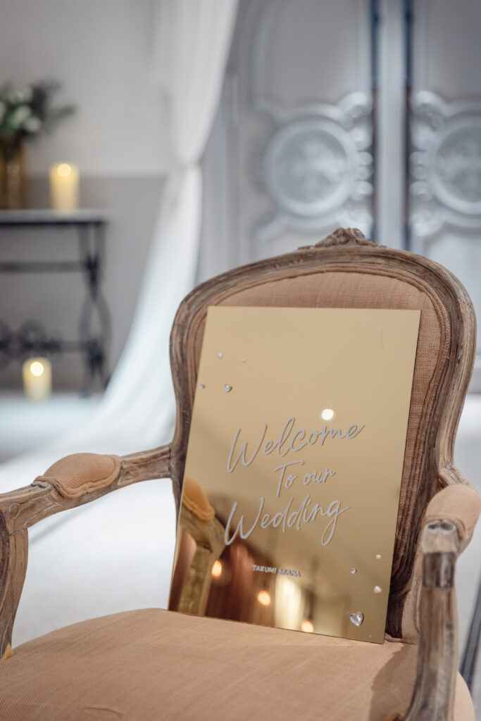 キラキラと装飾されたウェルカムボードが華やかに飾られ、これから始まる一日の物語に自然と胸が高鳴ります。