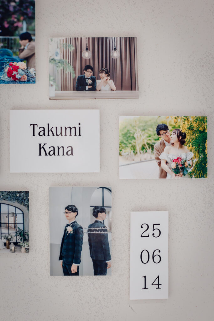 壁に並んだ前撮り写真たちがゲストの皆様をお出迎え。