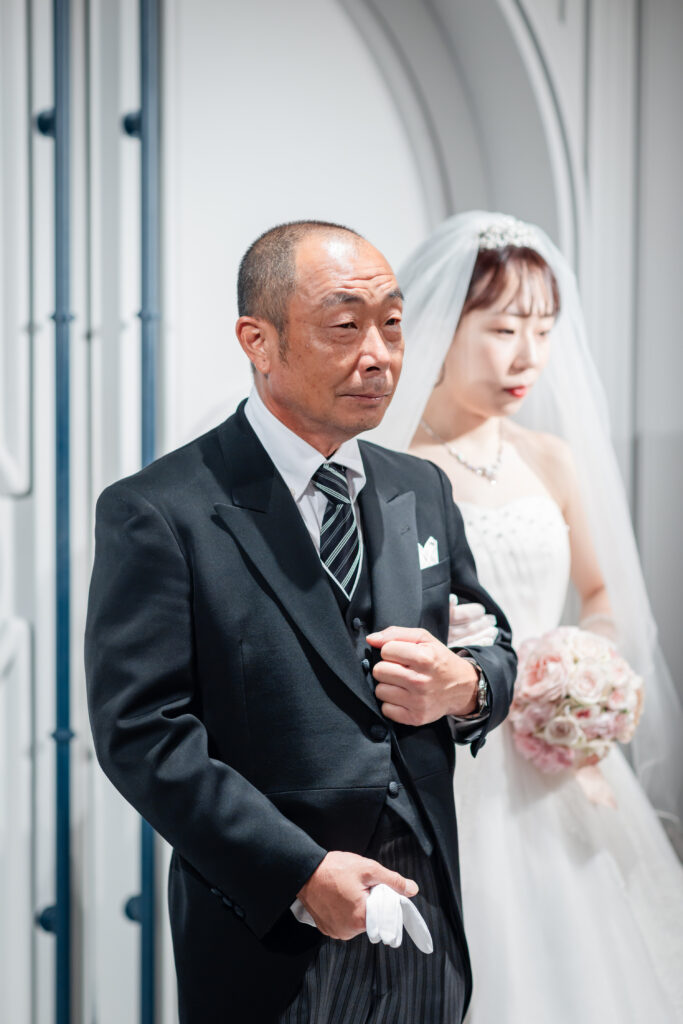 続いて、新婦はお父様のエスコートでゆっくりと入場。