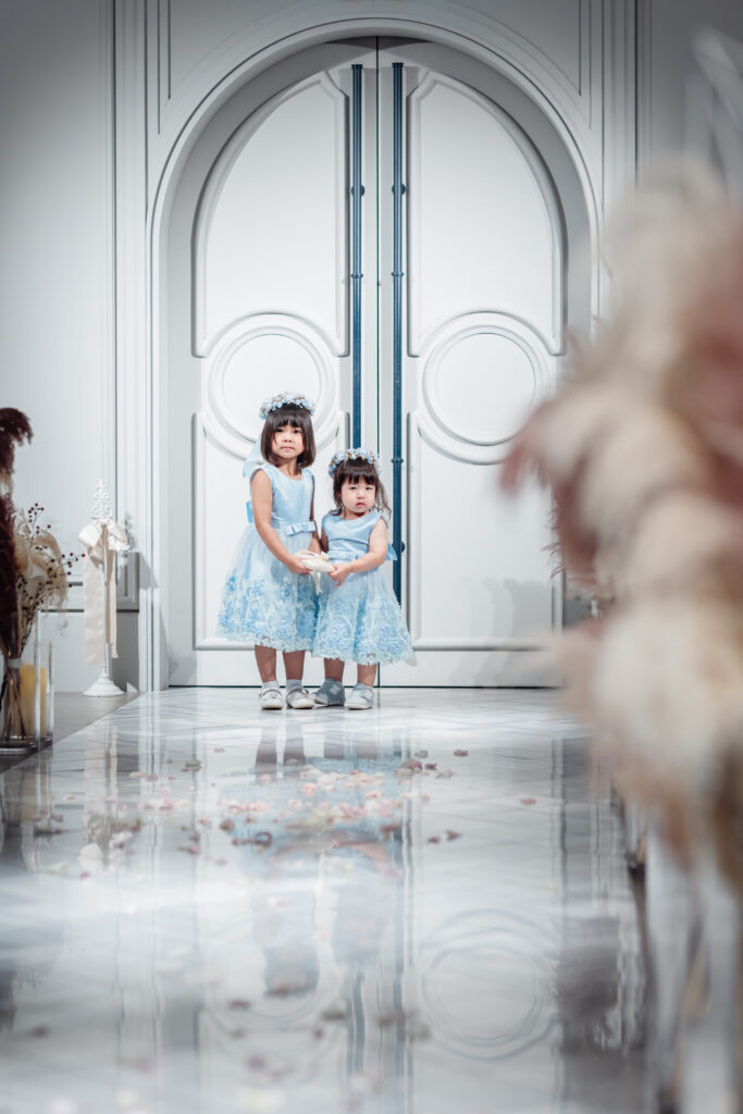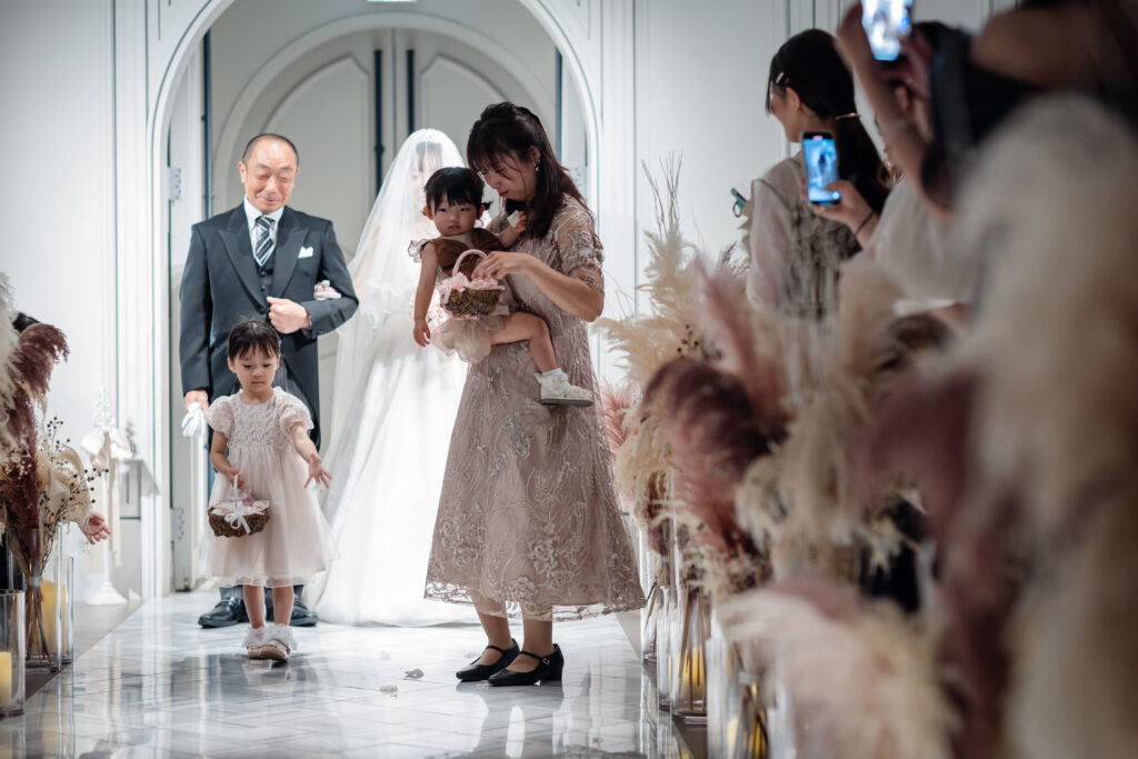 一歩を踏み出すおふたりの前をフラワーガールが清めながら進み、