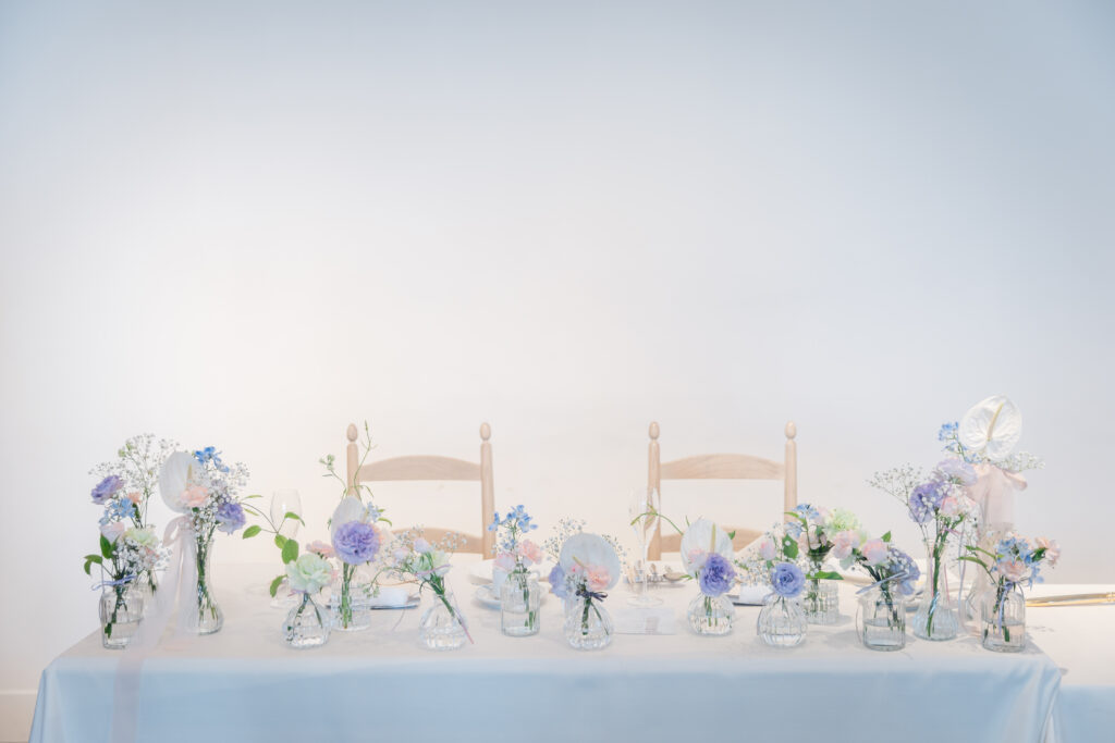パステルカラーのリボンを結んだ小瓶に、優しく彩る淡いテーブル装花たち。