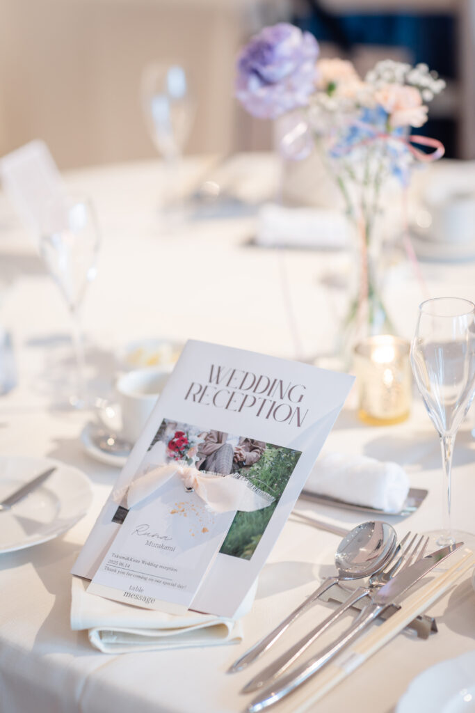 手作りのプロフィールブックと席札は、新婦様のこだわりが詰まったアイテムのひとつ。