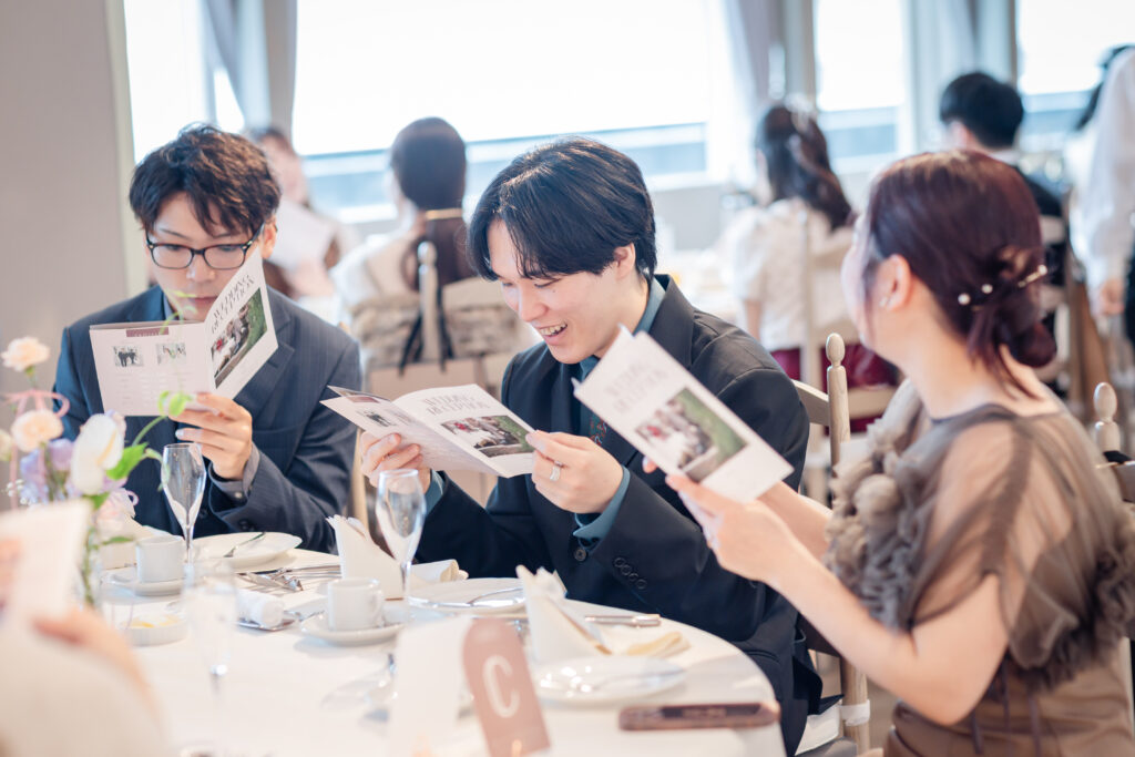 温かな光に包まれた空間では、ゲスト様がプロフィールブックを手に取りながら談笑されています。
