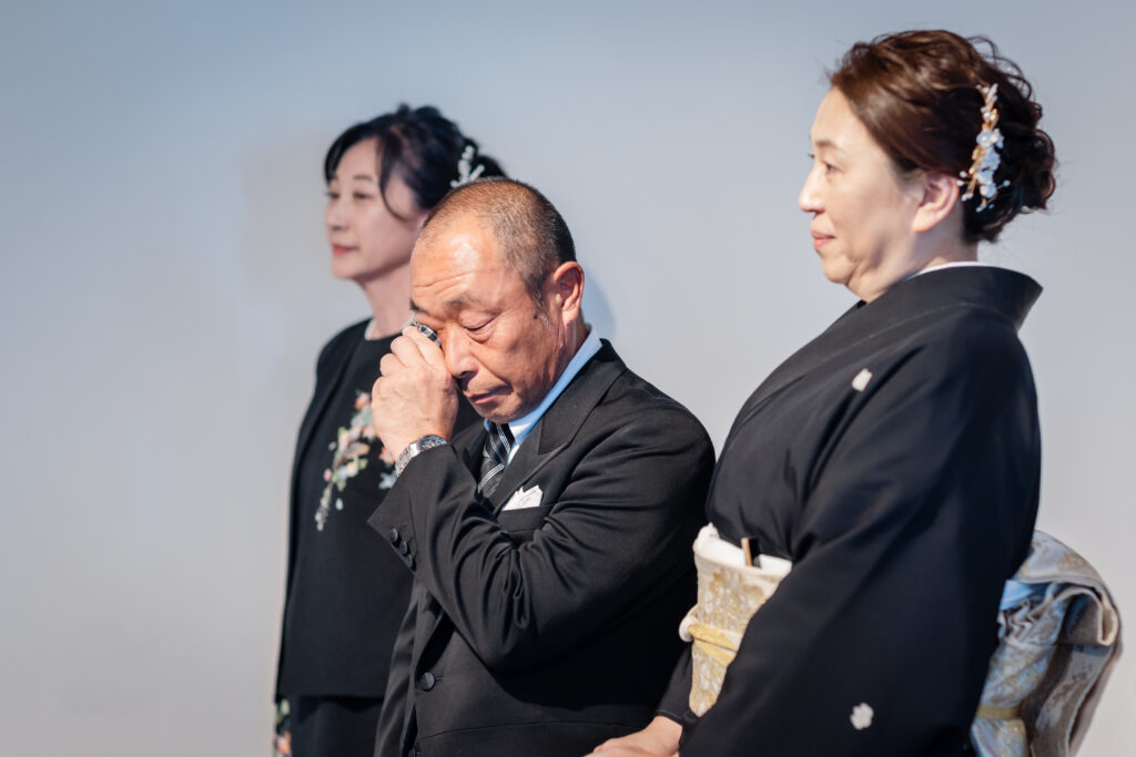 お言葉のひとつひとつに、会場中が静まり返り、お父様はハンカチで涙をぬぐいます。